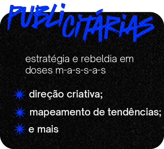 ei, pprt aqui a gente chama nossos serviços de rebeldias heheatuo com foco e experiência em redes sociais, criando designs para distintas plataformas, além de criar alinhamentos visuais que direcionam a estética da sua marca. também desenvolvo conceitos visuais para projetos e campanhas, com impacto e relevância.no viés publicitário (sim, eu sou quase publicitário formado ;), realizo direção criativa para campanhas, mapeio tendências do seu nicho, te oriento sobre como aplicá-las estrategicamente e guio sua marca a chegar até o público certo por meio de estratégias visuais conectadas ao design.Vem comigo, fio!!